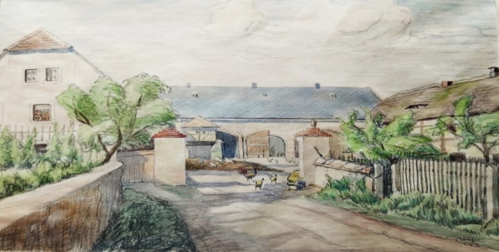 1955 Wie auf dem Bild des Hofes bei Fam. Trapp, so oder so ähnlich sahen in Unterreußen die Bauerhöfe noch nach dem Krieg aus. Das Wohn-Stallgebäude, ein Seitengebäude, die Scheune, der Bauerngarten vor dem Haus, freilaufende Hühner und der typische Misthaufen mitten im Hof. Seltener waren die Taubenhäuser, wie hier auf dem Bild, auf den Höfen zu sehen. Und das hatte auch einen gewichtigen Grund.  M. Trapp schrieb auf was er im „Der Heimatbote“ Heft 16 dazu gelesen hatte: „Einst waren Taubennester in hölzernen Simskästen unterm Dach angebracht. Der Taubenmist hat aber eine bis heute oft unterschätzte Eigenschaft, er wird sehr schnell heiß und war, gar nicht so selten, Ursache für Hausbrände. Aus diesen sehr praktischen Gründen baute man später die Taubenhäuser freistehend. Es wird gerechnet, dass ein Taubenpaar im Jahr einen Doppelzentner (100 kg) Körner frisst, und damit den Kreis der Taubenhalter von vornherein einschränkte.“ Dieses Privileg war schon früher auf die Hufen und ½ Hufen Bauern beschränkt.